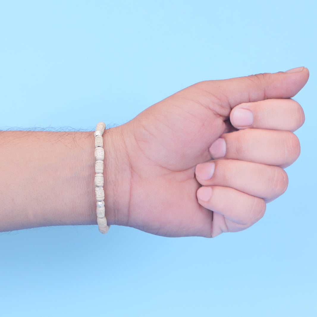 Sterling Silver Tulsi Bracelet - Cylindrical Carved Tulsi & Silver Beads, Mathura