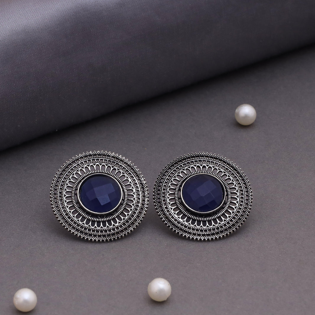 Oxidized Metal Earrings, Blue Stone, Ornate Border