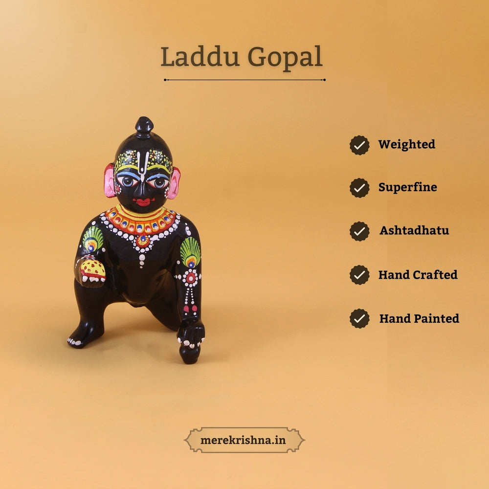 Explore this stunning Laddu Gopal idol, a divine representation of Baby Krishna, embodying deep religious, cultural, and spiritual essence. Handcrafted from Ashtadhatu with brass, it boasts a traditional, antique style with a glossy black finish. Crafted in Mathura, Vrindavan, India, this artisanal deity is ideal for Janmashtami, Radha Ashtami, gifting, or Laddu Gopal Seva.
